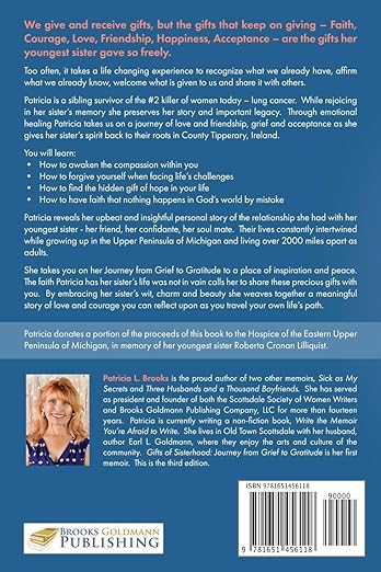 Excerpts from the back cover: Gifts of Sisterhood – Journey from Grief to Gratitude We give and receive gifts, but the gifts that keep on giving—Faith, Courage, Love, Friendship, Happiness, Acceptance—to name a few—are the gifts she gave so freely. Too often, it takes a life changing experience to recognize what we already have, affirm what we already know, welcome what is given to us and share it with others. Patricia L. Brooks is a “sibling survivor” of the #2 killer of women today—Cancer. Yet, she has rejoiced in her sister’s memory with this portrait of her sister’s courageous battle with Cancer and preserved her even more important legacy. Through emotional healing for her and her family, Patricia takes us on a journey of love and friendship to a time of grief and pain followed by acceptance while taking her sister’s spirit home to their “roots” in County Tipperary, Ireland.